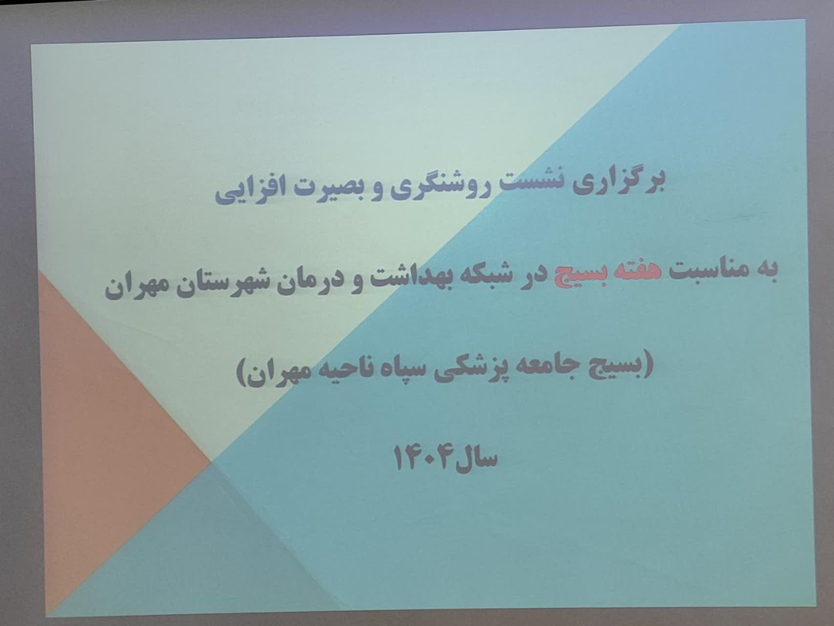 به گزارش روابط عمومی شبکه بهداشت و درمان شهرستان مهران،به مناسبت فرارسیدن هفته گرامیداشت بسیج، نشست مشترکی با عنوان «روشنگری و بصیرتافزایی» با همکاری شبکه بهداشت و درمان و سپاه پاسداران انقلاب اسلامی شهرستان مهران و با حضور کارکنان این شبکه برگزار شد.