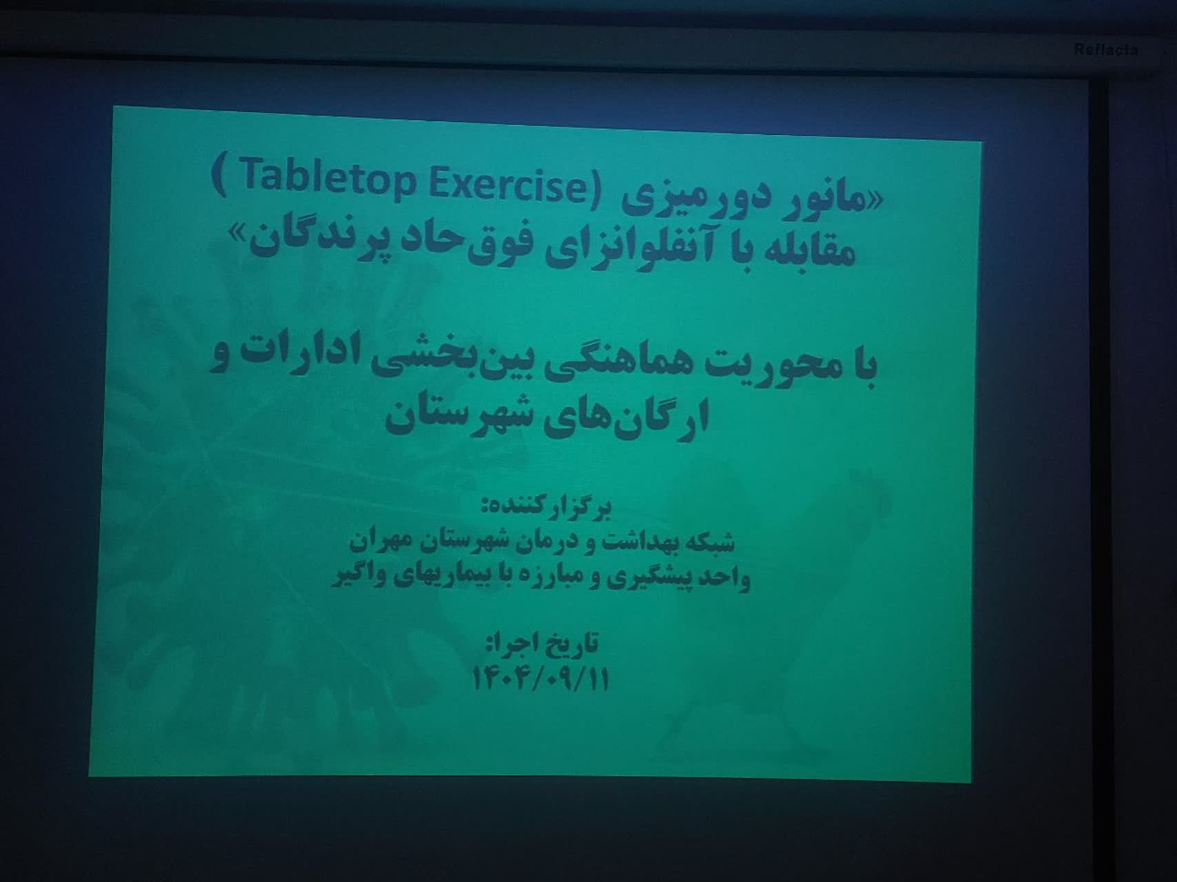 به گزارش روابط عمومی شبکه بهداشت مهران، مانور دورمیزی مقابله با آنفلوآنزای پرندگان با حضورمهندس اکبری معاون بهداشتی،خانم ترابی و آقای رئوف نژاد کارشناسان واحد بیماری های واگیر و نمایندگان دستگاه‌های اجرایی مرتبط در این شبکه برگزار شد.
